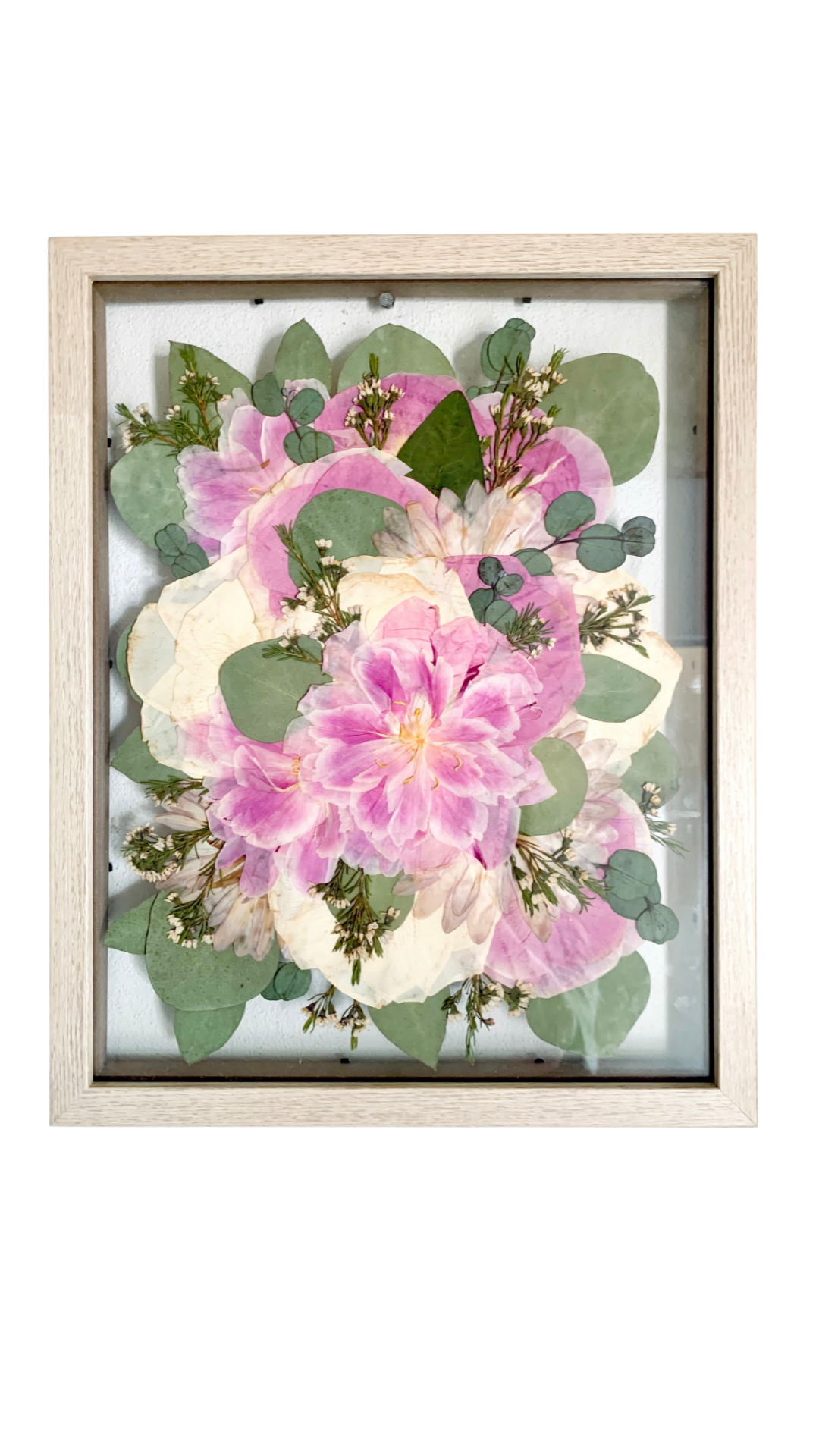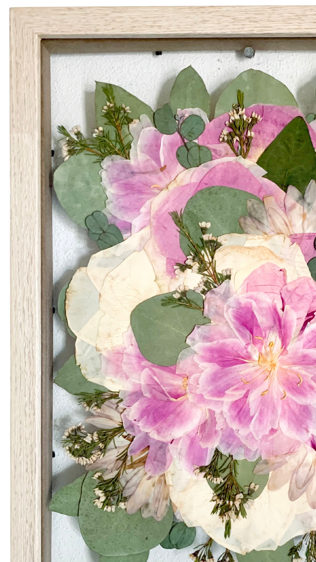 Framed botanical display with pressed leaves and flowers, labeled with plant names such as rose, tulip, eucalyptus, lamb's ear, tutsan, and elder gum.