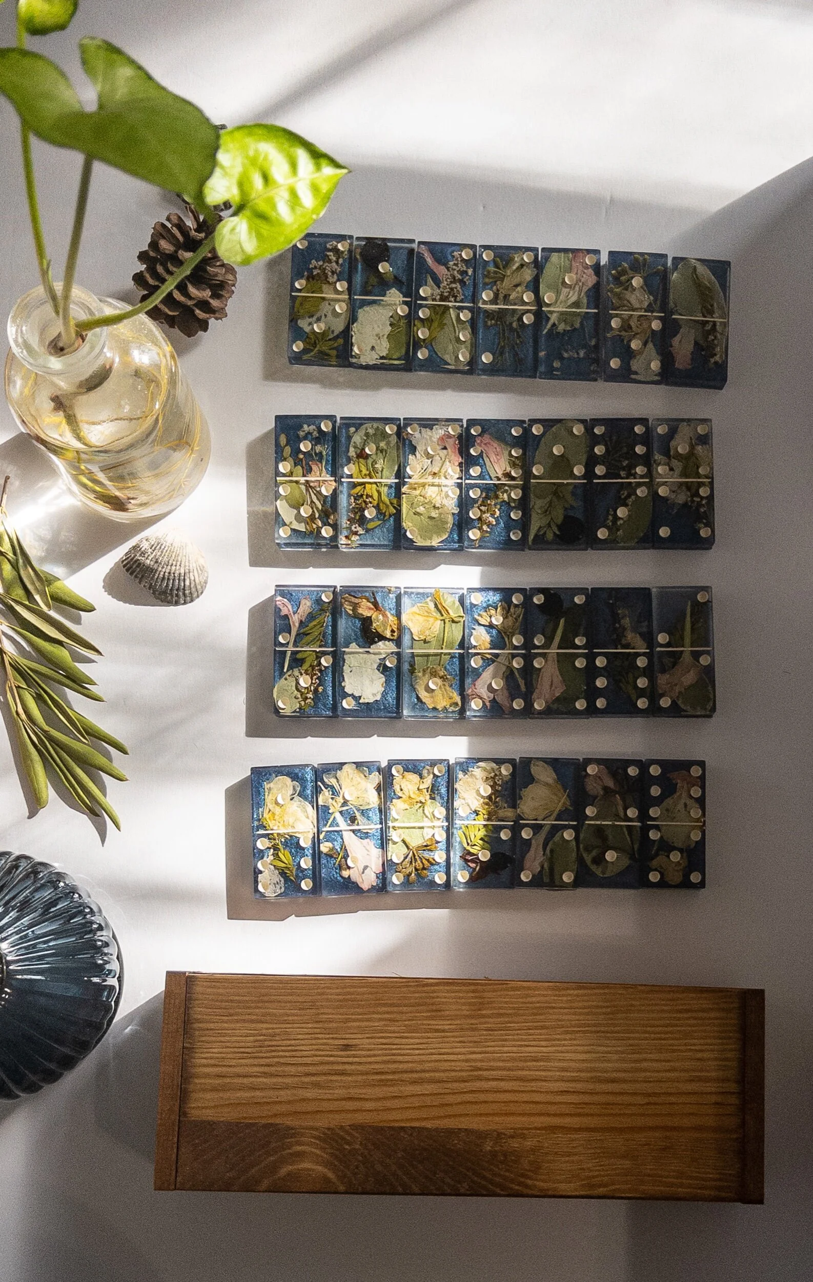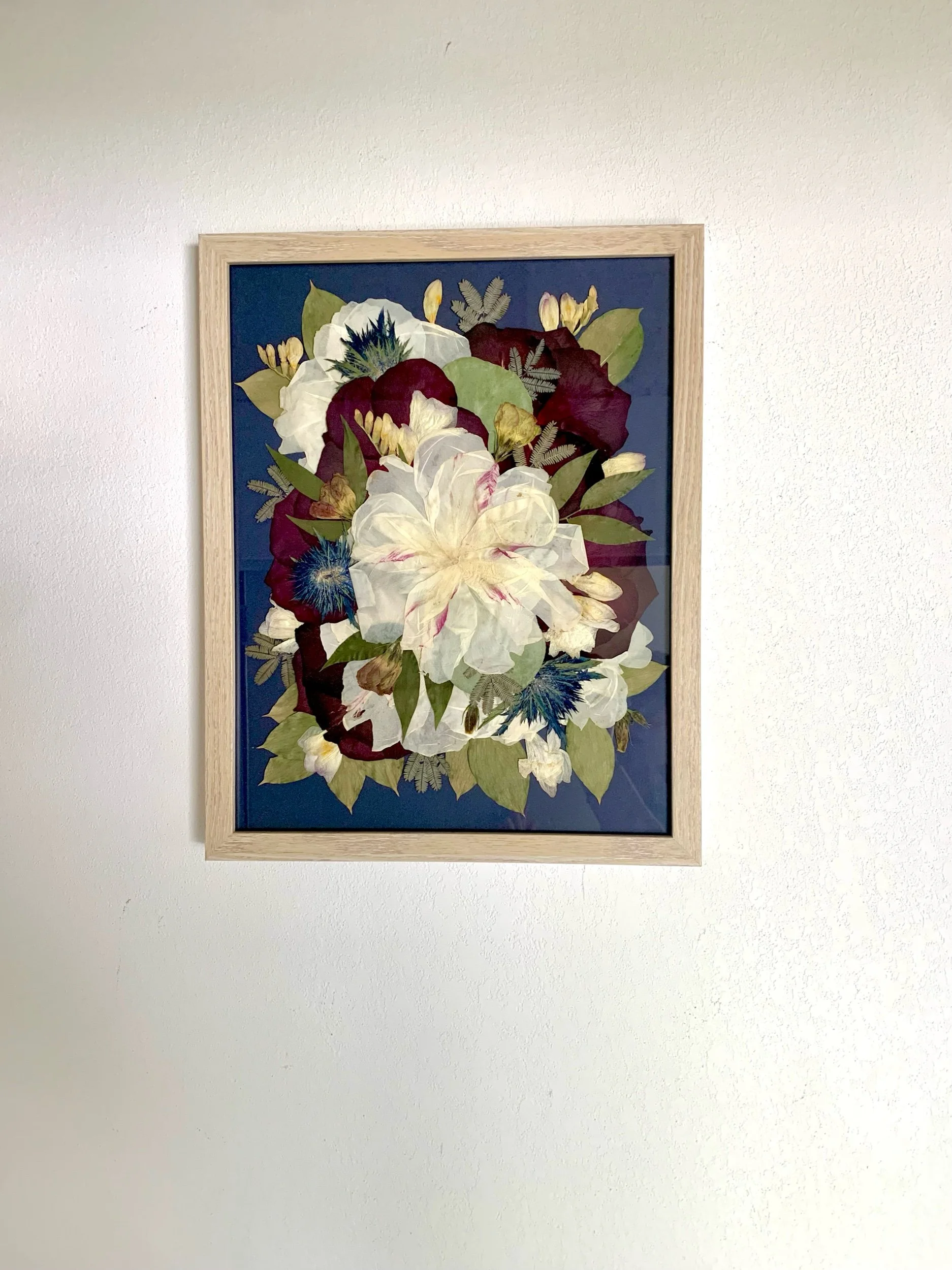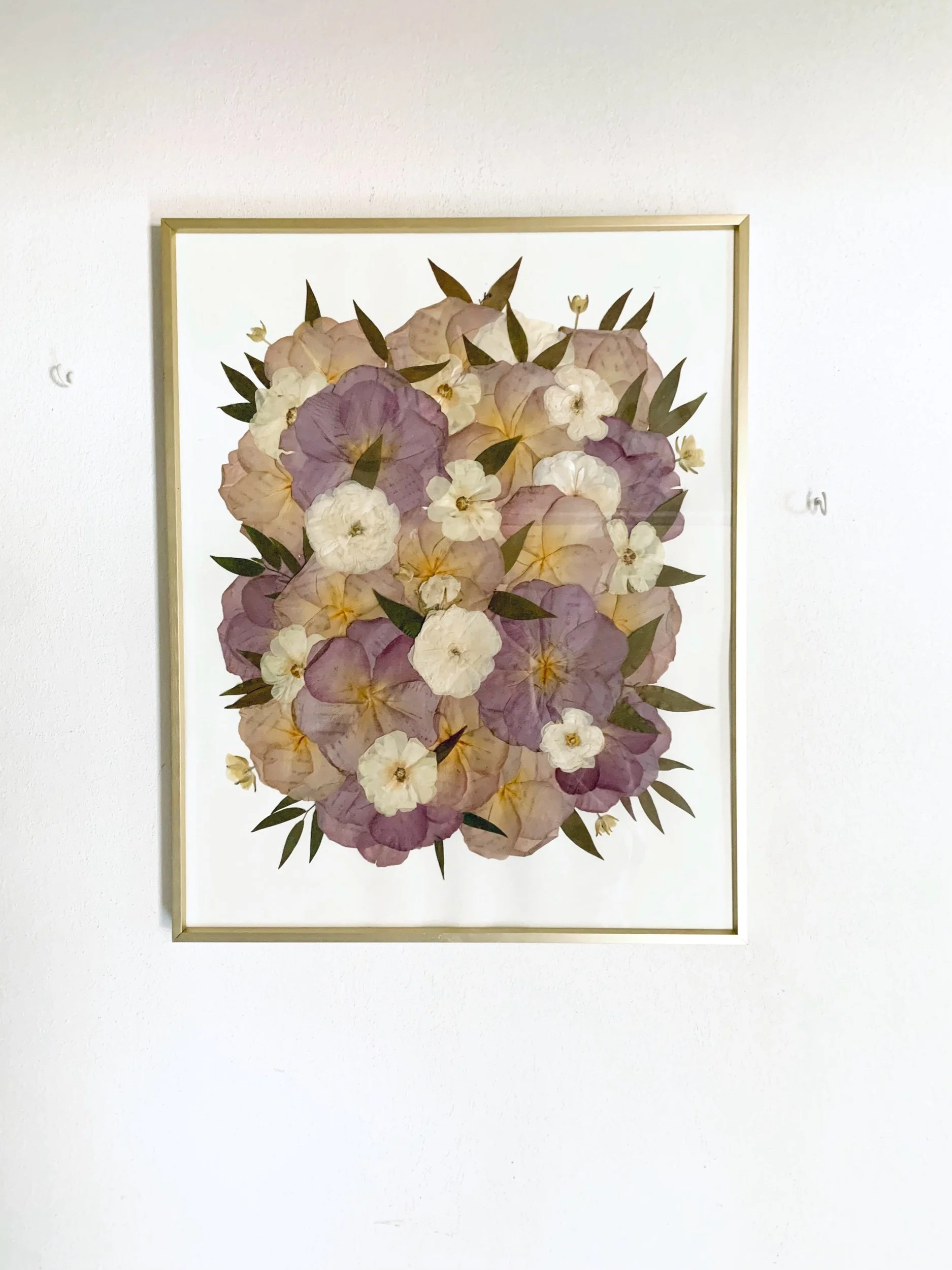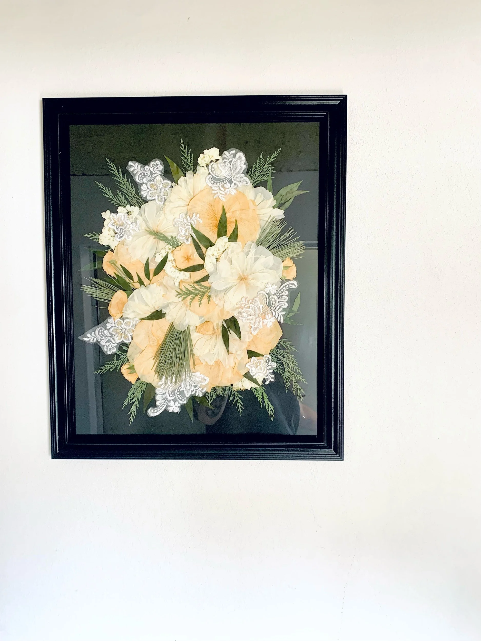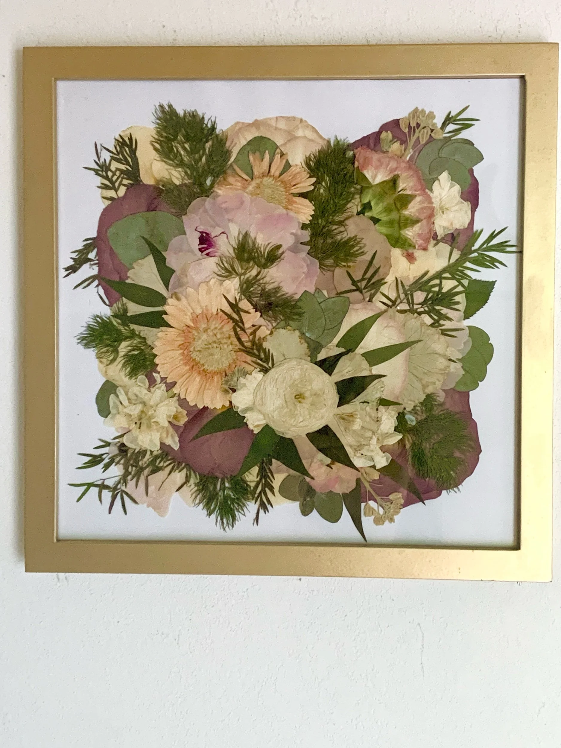 Minimalist- This is a more modern styling. Pressed blooms and greenery in your bouquet will be individually displayed throughout the frame. Multiple of each floral will be used with no elements touching.
