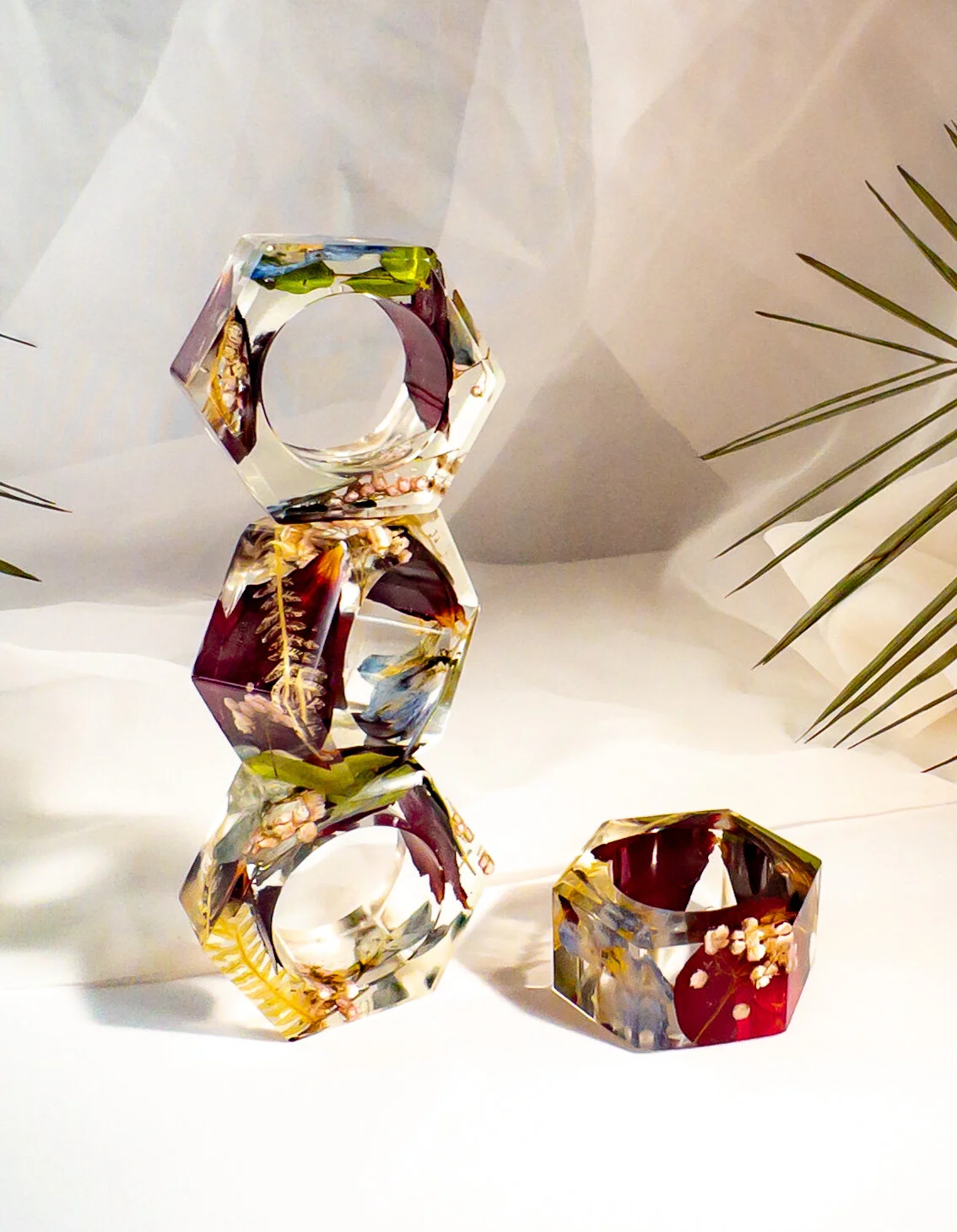 Preserved flowers bolo tie measures about 2”x1.25” with adjustable leather cording.